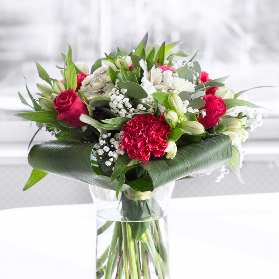 - Unique blend of chrysanthemums, gypsophila, red roses, carnations, white alstroemeria, and aspidistra leaves