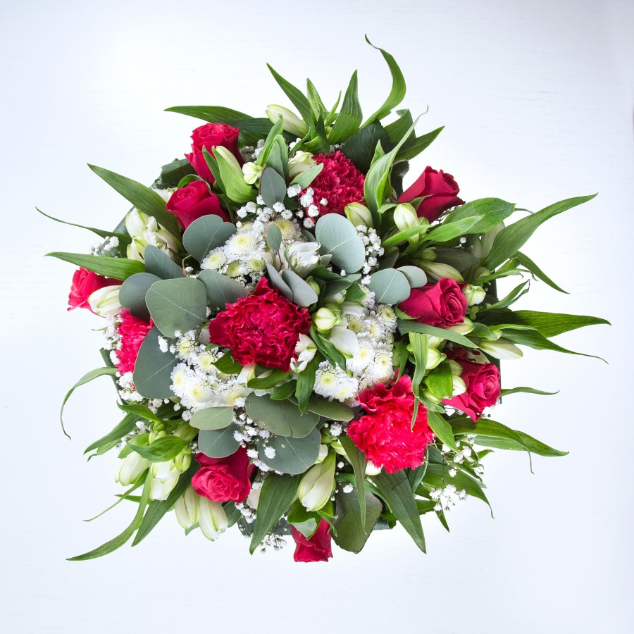 Indulge in the exquisite beauty of our hand-selected floral arrangement that promises to captivate your senses. This bouquet features sweet white chrysanthemums paired with delicate gypsophila, luxurious red roses, and vibrant carnations. Every stem, including pristine white alstroemeria and lush aspidistra leaves, is carefully chosen to create a harmonious display of colors and textures.