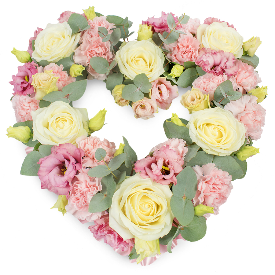Share your deepest sympathies with our Refined Open Heart Sympathy Bouquet. This elegant arrangement combines white roses, pink carnations, pink lisianthus, and eucalyptus leaves into a unique and heartfelt tribute.